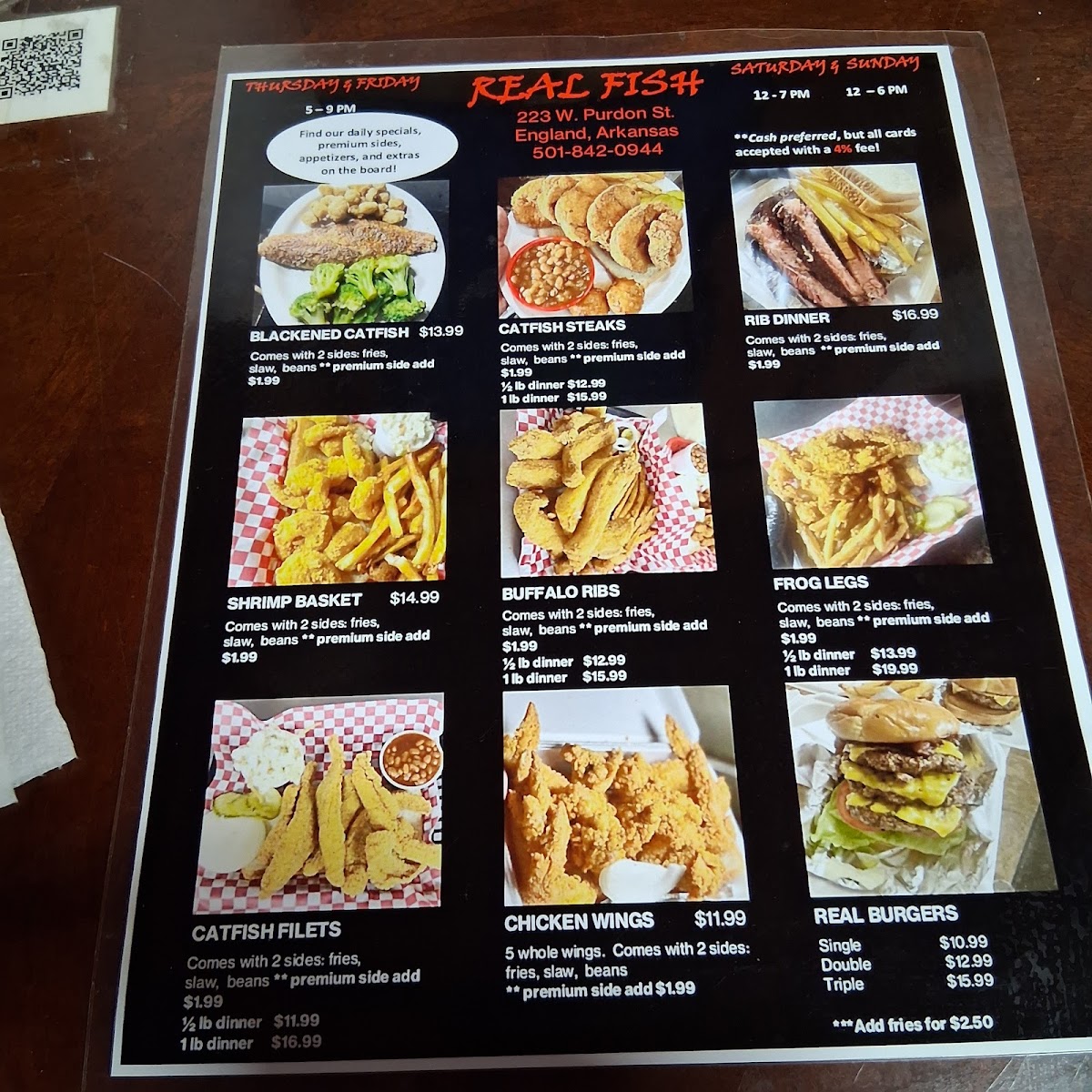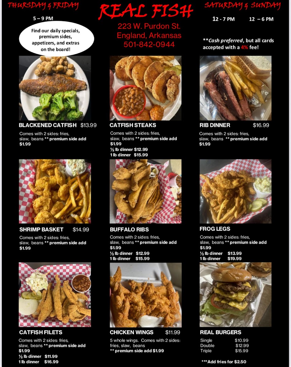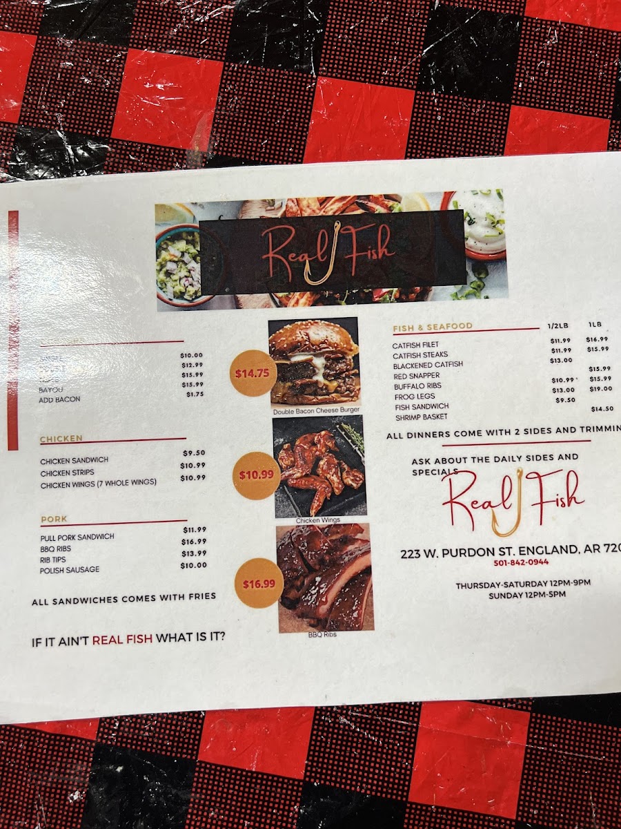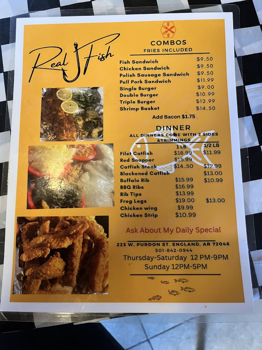 When you step into Real Fish, you're in for a treat that celebrates the ocean's finest flavors. This cozy spot in England, Arkansas, brings a fresh, mouthwatering selection of seafood that’s sure to satisfy any craving. The Real Fish Menu offers everything from crispy fried fish to perfectly grilled fillets, and don’t miss their signature seafood platters that highlight the best catches of the day. Whether you're in the mood for something light or hearty, there’s a dish that will hit the spot. With every bite, you’ll taste the care and quality put into each meal. The atmosphere is casual and welcoming, making it the perfect place for a relaxed dining experience with family or friends.